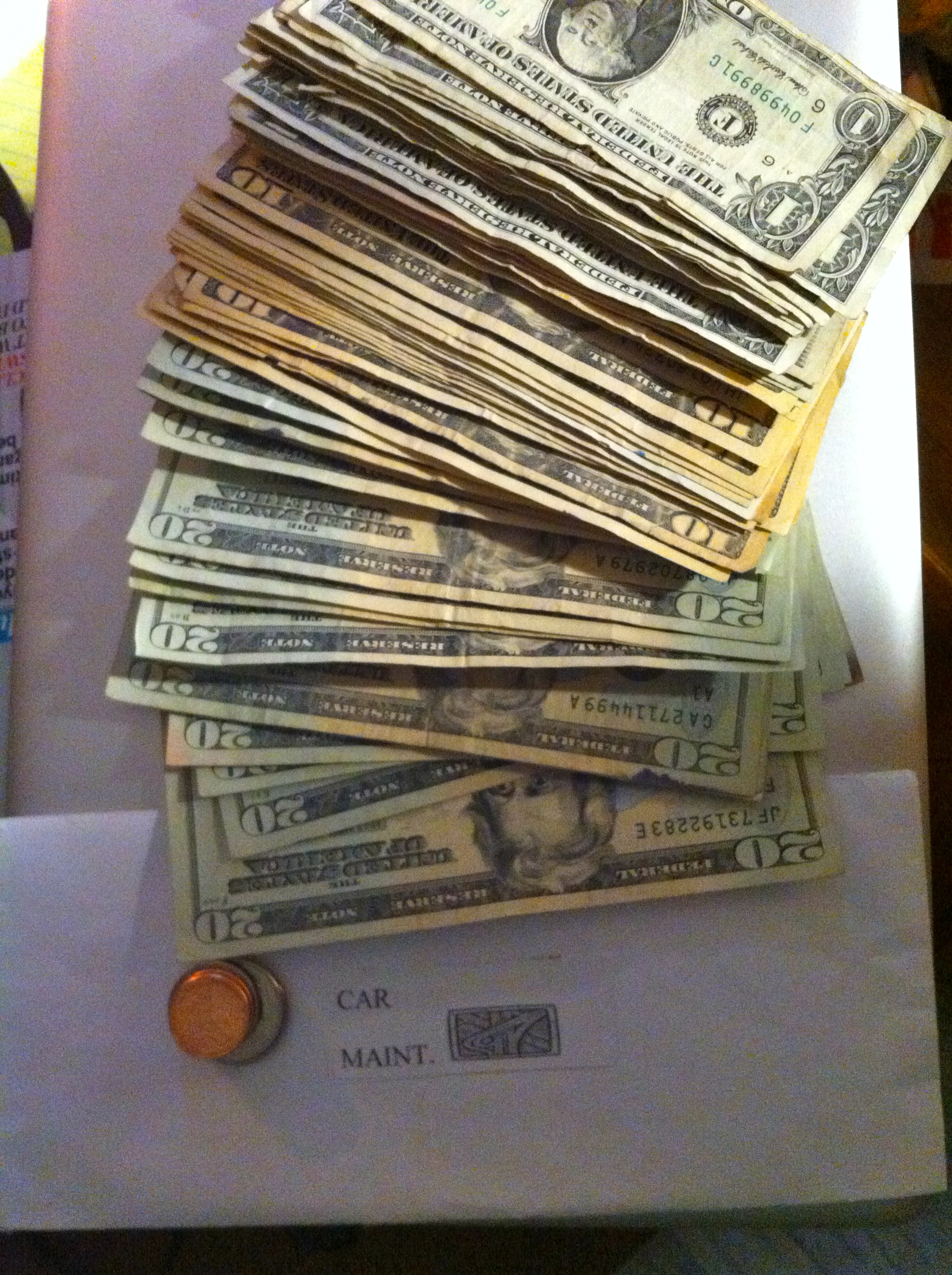 3. Since The Beard and I crossed state lines from Kansas to Missouri last year, it’s time for me to register my car in Missouri. Funny thing about Missouri is that they required an annual inspection of your car done at a qualifying inspector’s garage usually costing about $12 – $15. I took my little Volvo into what seemed like a more lenient establishment (read: ghetto garage) in hopes that any minor issues they may find would be overlooked. Boy was I called out in that assumption when they flunked my adorable little car. They were nice about it but she took it pretty hard. They gave me a quote to fix the issues and off I went to the very affordable Volvo specialist mechanic that I use who guarantees a 2 year warranty on all his jobs. Because if I’m going to drop money to pay for something, I want the peace of mind that it’s covered for at least the next 2 years. To my surprise, my mechanic’s quote was $40 more than the other guys. Now this didn’t bother me much because I trust my mechanic but I did mention it to him. “Ya that sounds fine, Tyler,” I said, “I’m just kind of surprised to hear that your quote is $40 more than the inspector’s place.” Tyler was surprised by it too, but he knows great customer service and offered to drop off $24 from his quote. So now I have the best mechanic in town working on my car and the repair is covered under warranty and it only cost me $16 more. Now that’s a great deal. All because I spoke up. I still had to empty my entire Car Maintenance envelope.