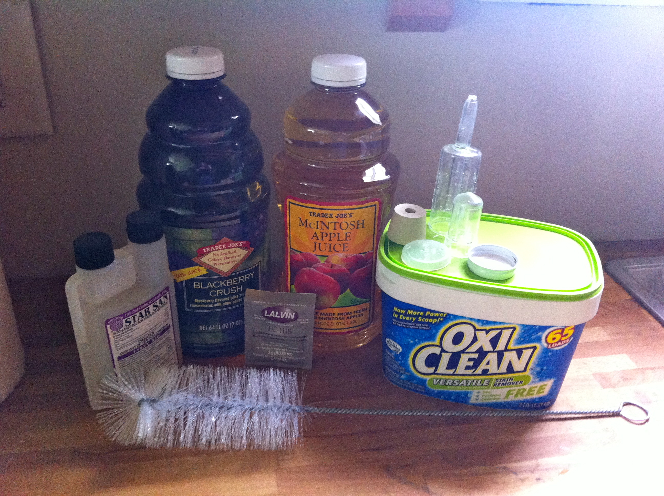 We gathered the necessary supplies. Luckily, because The Beard is a skilled home beer brewer, we already had a gallon jug with a cap, cleaning/sterilizing supplies, and an airlock stopper.