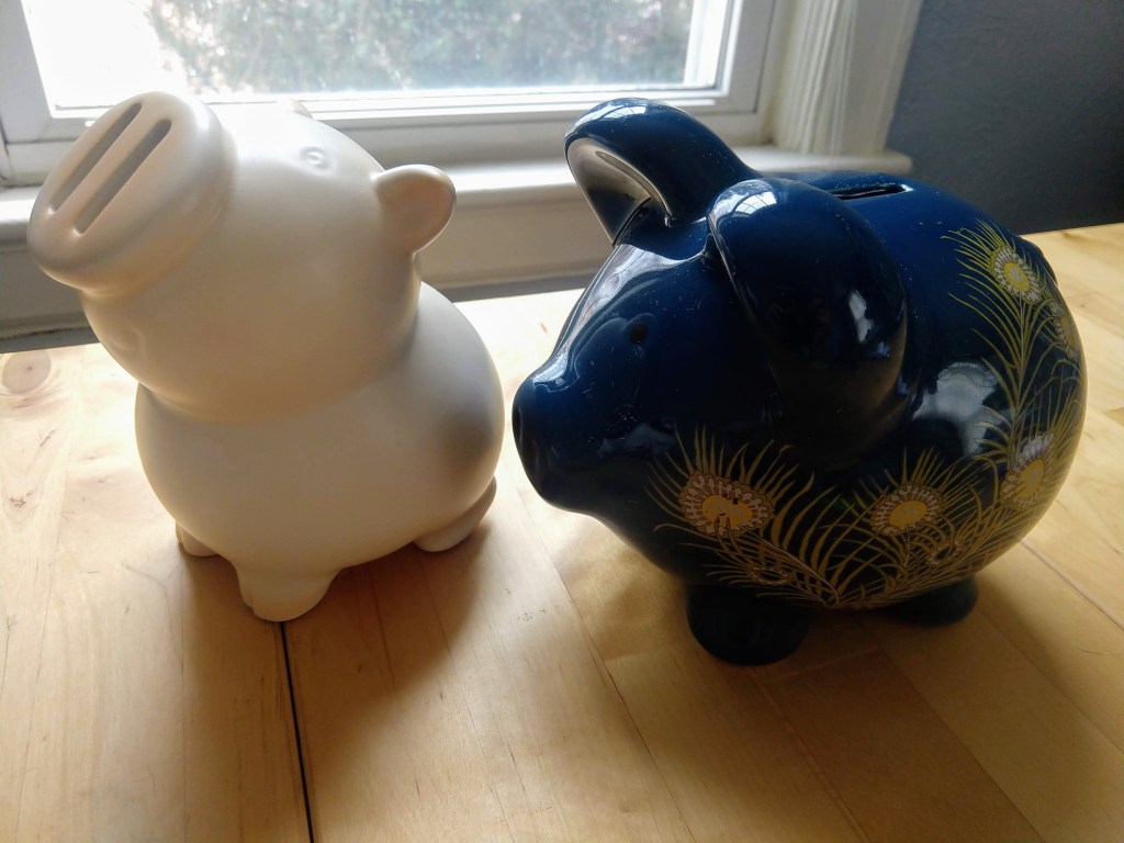 I realized that I hadn’t counted their holdings last year. So it’s been two years of random change tossing with the rogue loose dollars getting dropped in the mix. I don’t have a strict system. When my purse, pockets, or work bag gets too jangly with coins, I off load them into either Porky (who lives upstairs) or Peacock (who lives downstairs). Whichever is closer to me at the moment.